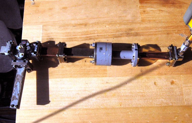 | 黒い箱は24GHz帯導波管入力、強制空冷ダミー(100W級)箱上はサーキュレーター、導波管右が20dbカップラーです。これらを使用し、次にTWT-PAの調整・電力測定をする予定。また、ANT調整にもこれを使用いたします。 ネットアナなど高級な測定器などありません。トホホ・・・ |