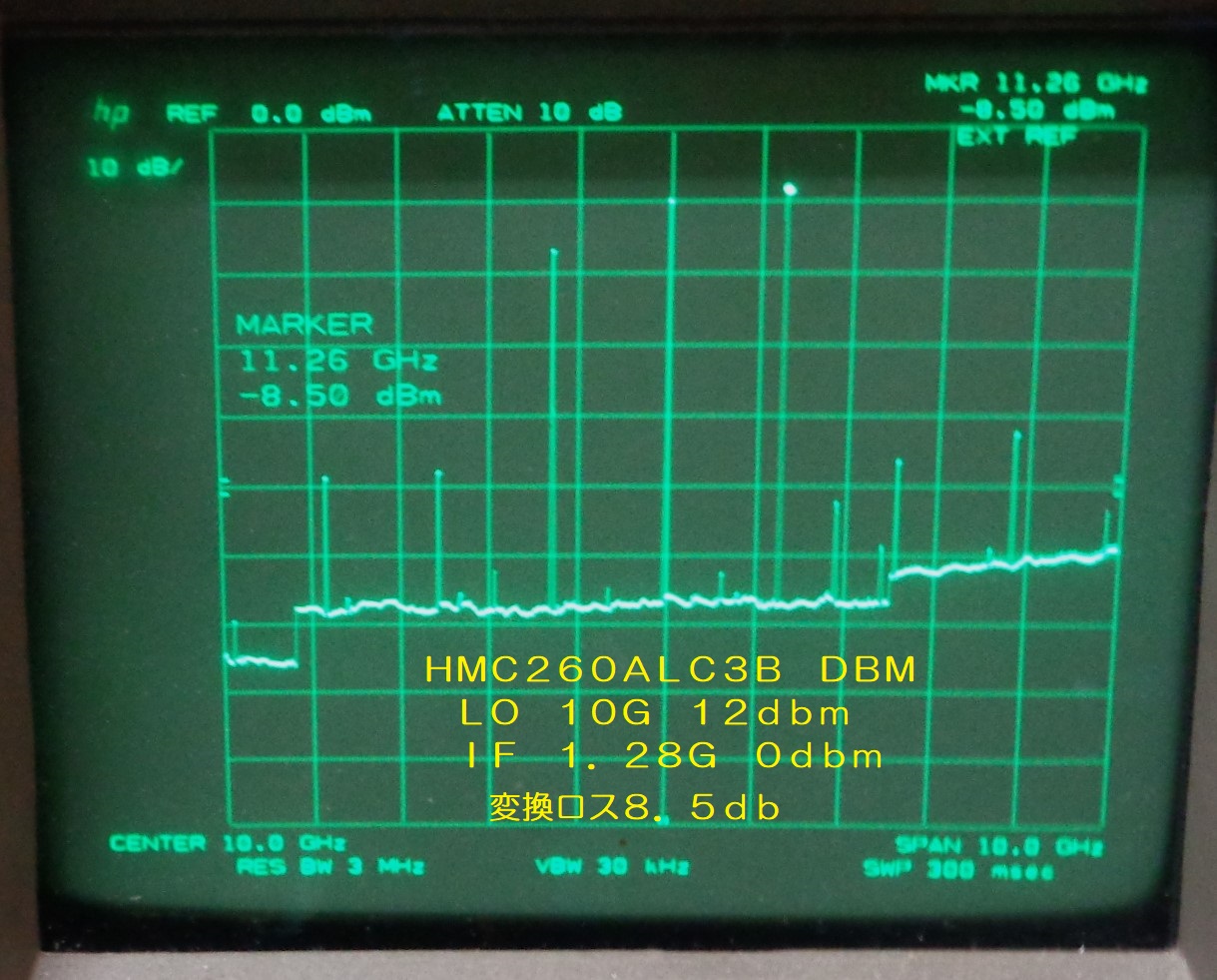 HMC260ALC3B DBMを試しました。 300G画像伝送の実験を色々していますが、実験セットが冷えて居る時と一時間位 ヒートランで受信品質が変化している。 75G逓倍アンプのドライブや12.5G帯MIXのFETバイアスの調整で変わり最良点が判らない。 そこで10G〜26.5Gに使えるDBMを試しました。 3mm角でピン間隔も0.5mmと小さく扱いにくい。 キャリアーの変換特性はカタログ値に近く測定誤差程度と思われる。 300GのMIXと取り換えるもDVB-S信号の波形が悪く復調しない。 真ん中が盛り上がりフラットで無い。 原因が判らない。 LOレベル、IFレベルを変えるも波形の変化はない。 FET MIXはバイアスや入力レベルを変えると波形が変化して品質の良い所に調整出来る。 以前の実験ではDVB-SやISDB-T信号もDBMで変換しても問題なく中々難しい。 JA3CVF 森本 /和歌山県日高郡 |