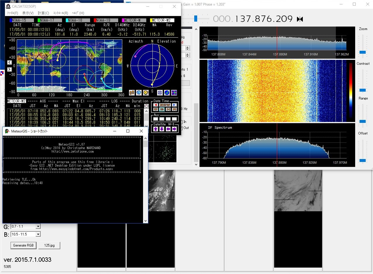 ロシアの気象衛星で、一日に朝2回、夜2回飛来します。 GISを使用して、地図上に気象衛星からのDataを先月から表示できるようになりましたので 参考に画像を添付します。 なお、ご存知かと思いますが信号はBPSKですので、sdr#にBPSKをPliginしないと 受信できません。また最近のsdr#ではできませんので、1300番台のsdr#を使用 されてください。 @Meteorを受信してる画像。 A取得画像。 BGISを動かして取得した画像。